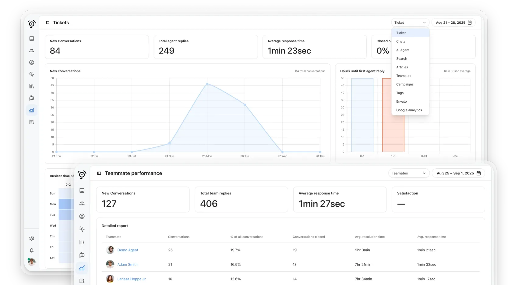 Suivez les performances des agents, temps de réponse et taux de résolution en temps réel